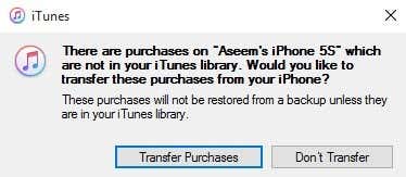 You might also get a message asking if you want to transfer purchases to your iTunes library. You should click Transfer Purchases, otherwise you might be missing music, apps, ringtones, etc. when you go to perform a restore later.
