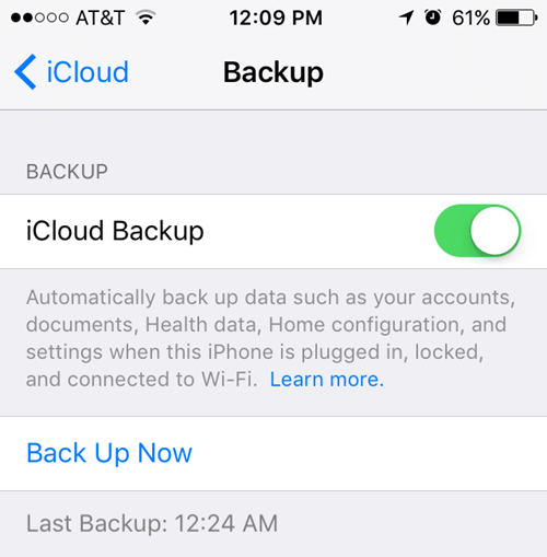 Also, note that you can leave the Automatically Backup Option set to iCloud and simply perform manual local backups every so often. iCloud should backup your phone automatically, but you can always perform a manual iCloud backup by going to Settings, iCloud, Backup and then tapping on Back Up Now. It should also show you the date and time of the last iCloud backup.