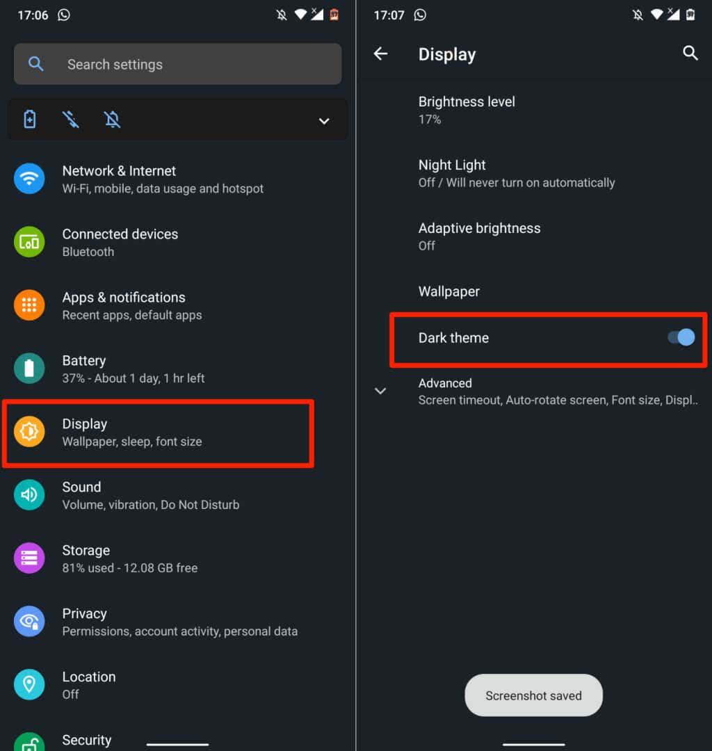 Open the Settings app, tap Display (or Display & brightness), and toggle on Dark theme (or Dark mode).