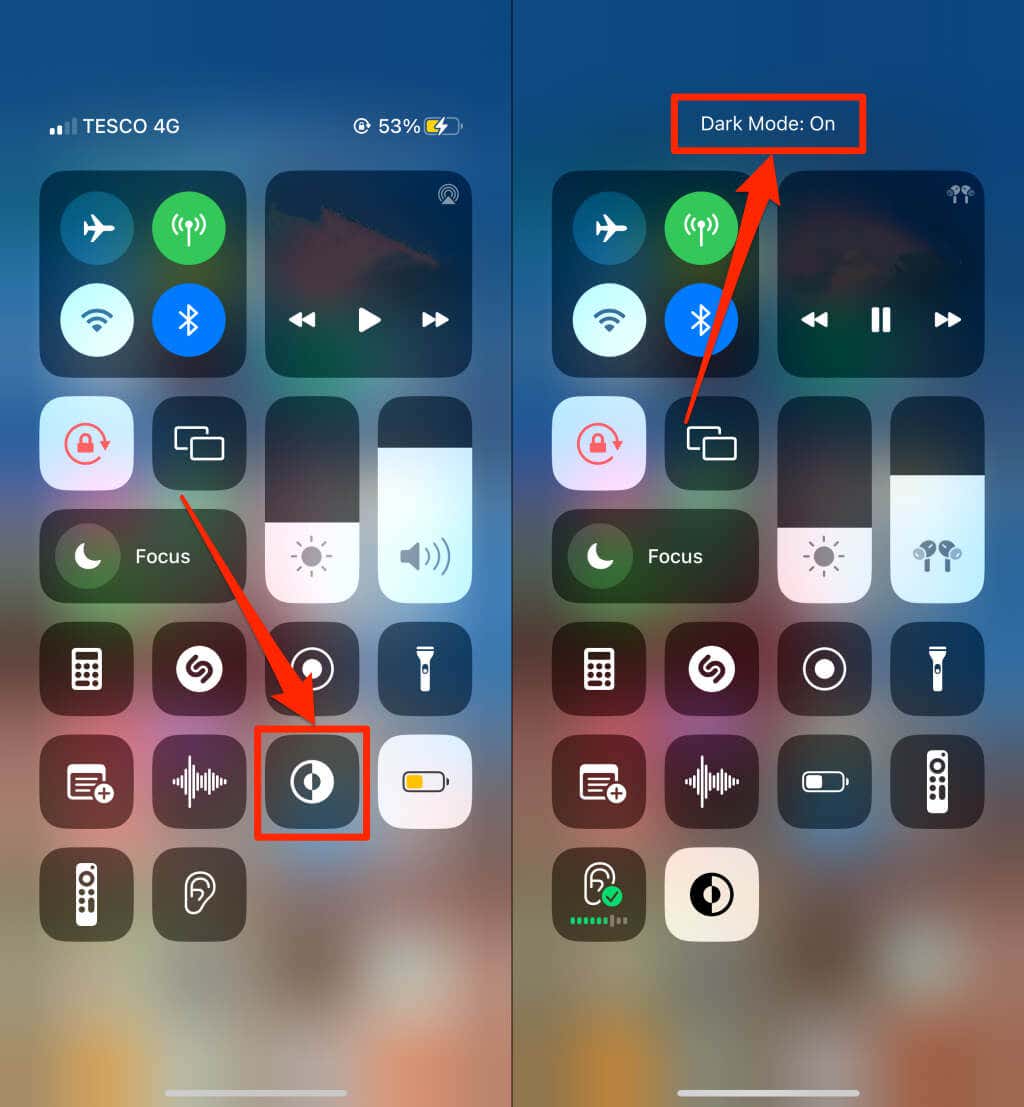 You can also enable or disable dark mode from your device’s Control Center. Open the Control Center on your iPhone or iPad and tap the Dark Mode icon. You should see a “Dark Mode: On” message at the top of the Control Center.