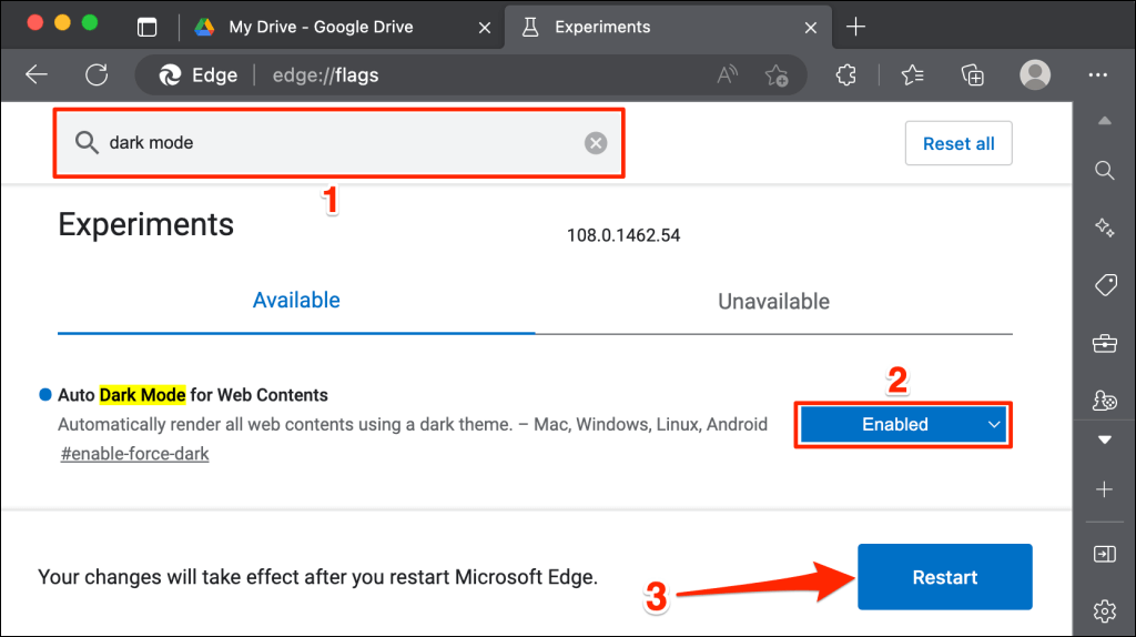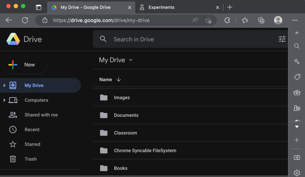 Microsoft Edge’s default dark theme doesn’t work with Google Drive, but the experimental dark mode does.