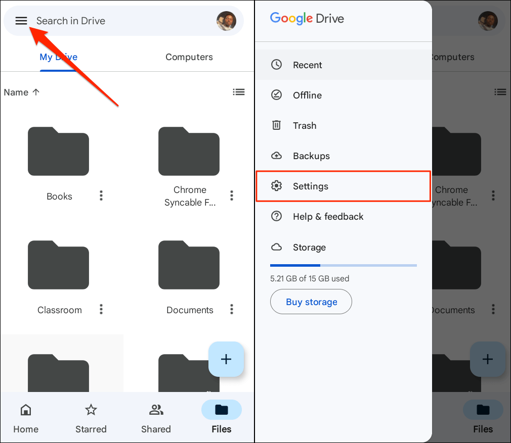 - Open Google Drive, tap the hamburger menu icon in the top-left corner, and select Settings.