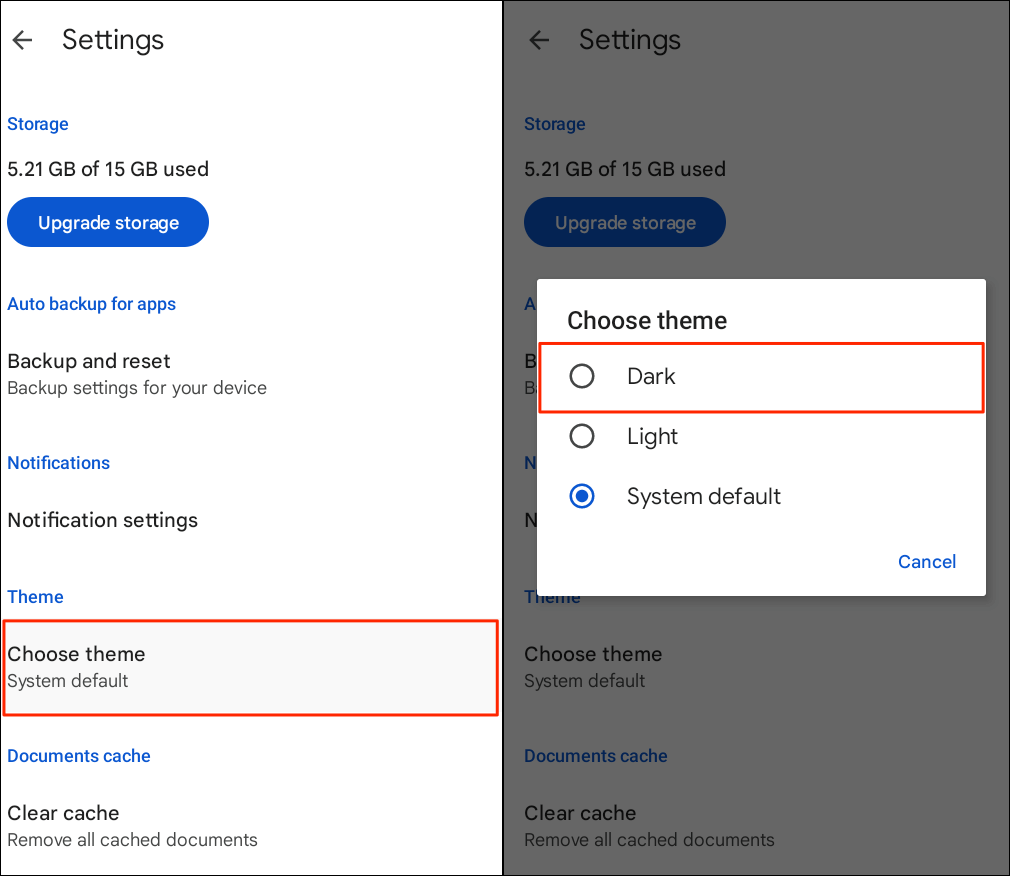 - Tap Choose theme in the “Theme” section and select Dark on the pop-up.