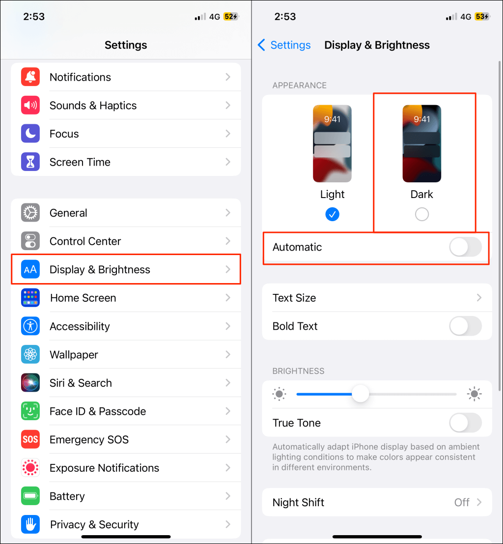 Go to Settings > Display & Brightness and choose Dark in the “Appearance” section. Toggle on Automatic to set a custom schedule for Dark Mode on your device.