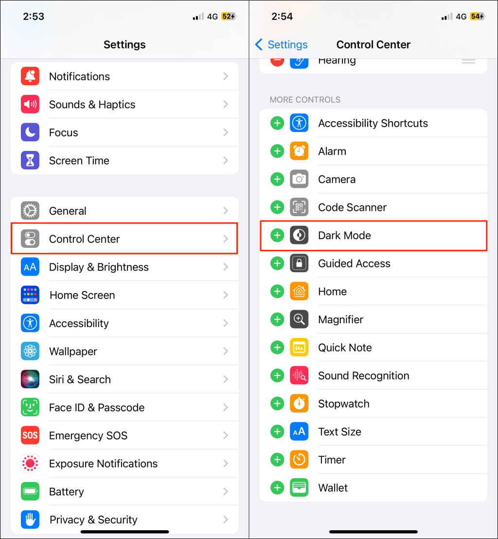 Can’t find the Dark Mode icon in the Control Center? Head to Settings > Control Center, tap the green plus icon next to “Dark Mode,” and check again.