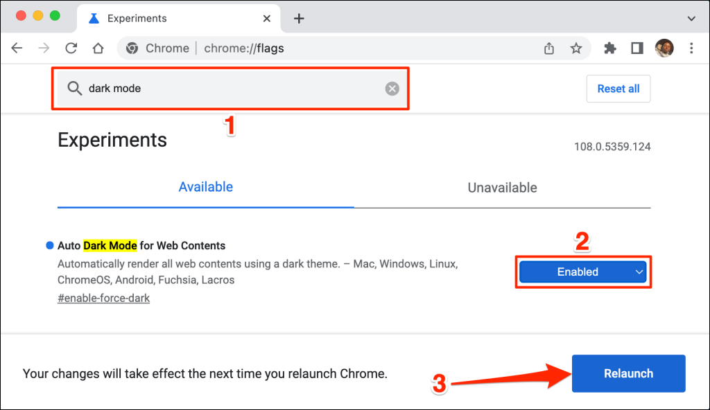 - Choose Enabled in the drop-down menu to activate Chrome’s experimental dark mode.