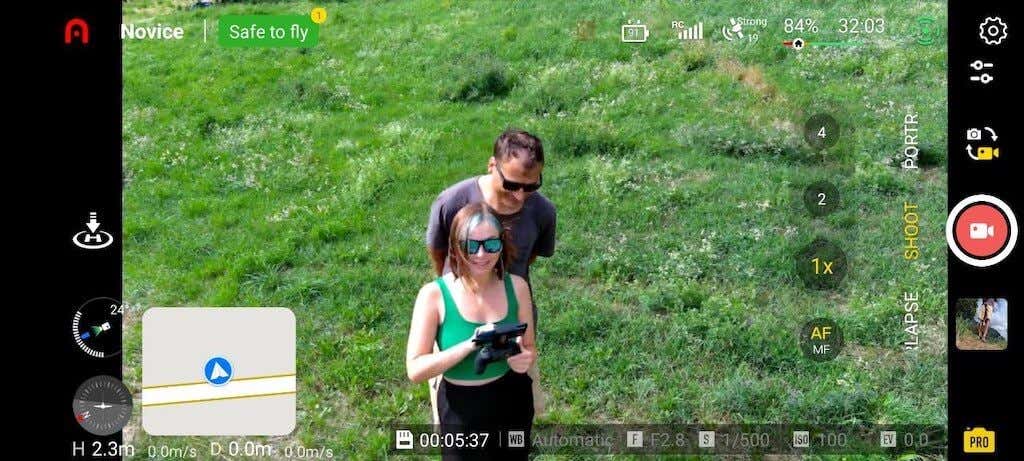 1. All the Flight Info You Need. The app shows you all the important information while your drone is flying. There’s a little map in the bottom corner so you know where your drone is and which direction it’s facing. On the top corner, you can see how much battery is left and how long your drone can fly. If your drone goes too far from where you started, the app will change colors to tell you to bring it back.