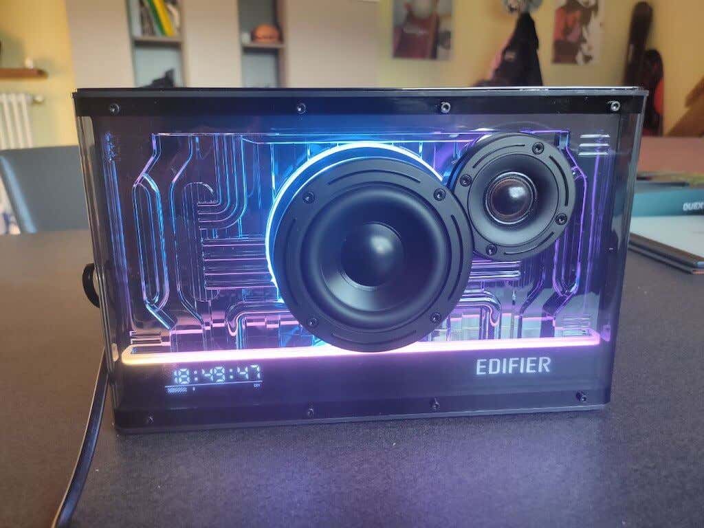 However, this tabletop speaker’s main selling point is the incredible light show that you’ll immediately be drawn to. The speaker’s light display can be changed using a knob or the Edifier Connect app. The light show looks impressive, especially when listening to music in the dark. The QD35 has an industrial design with a top panel that resembles a semi-trailer, and it has a big Edifier logo on it. It’s available in black or white, and I had the black version for the purposes of this review. There’s also a built-in clock on the bottom front panel.