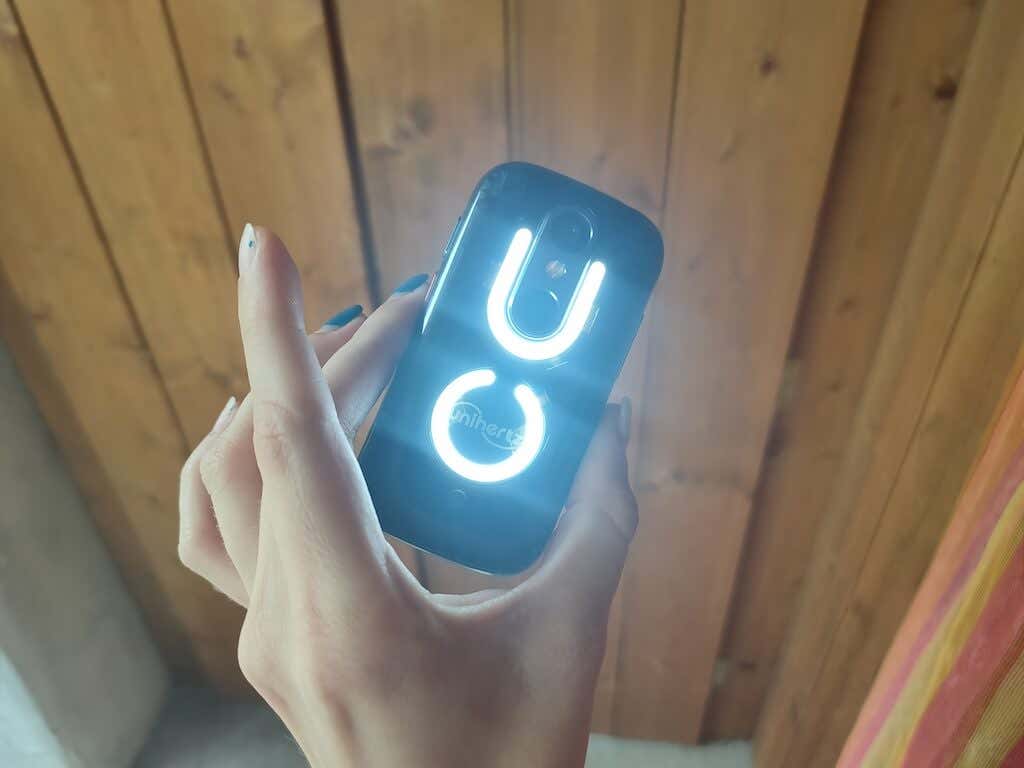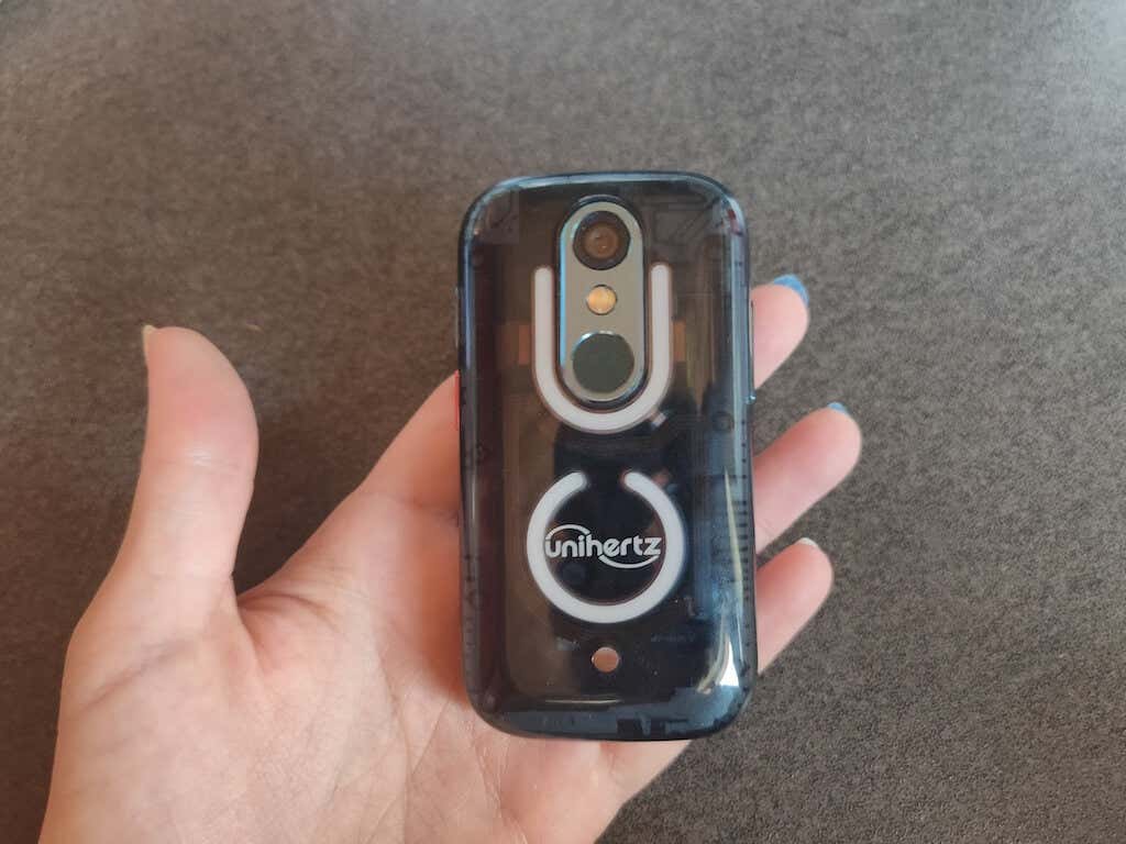 When you flip the phone over, you’ll see a translucent back with a prominent Unihertz logo. There’s a single camera lens, a flash, and a fingerprint sensor with a sleek metallic finish. The fingerprint sensor and Unihertz logo are flanked by two small but bright LED strips.