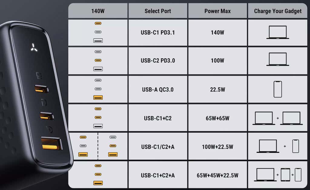 - Max Power Output: 140W (for single-port charging)