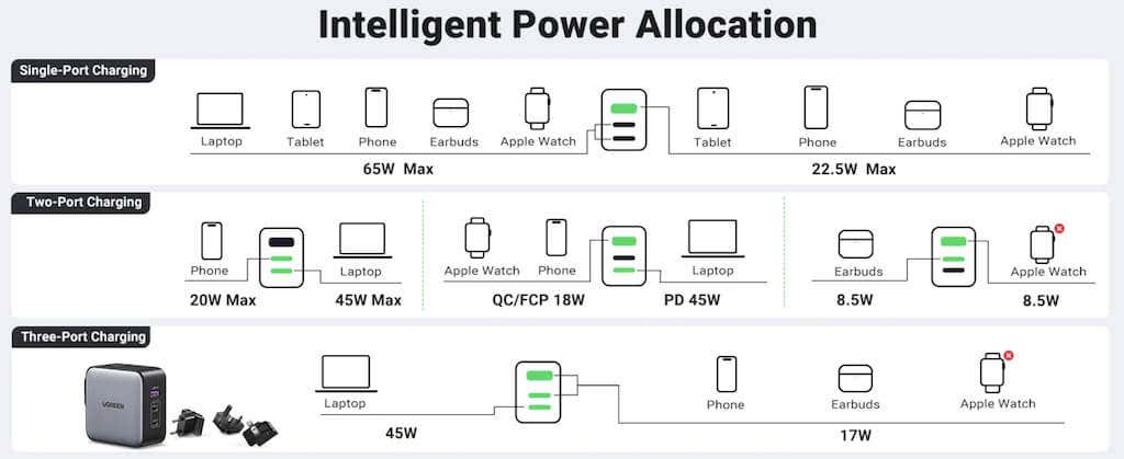 However, bear in mind that you’ll only get the maximum 65W output if you’re using only one charger’s port at a time. Otherwise, the power output will differ depending on how many ports you’re using simultaneously.