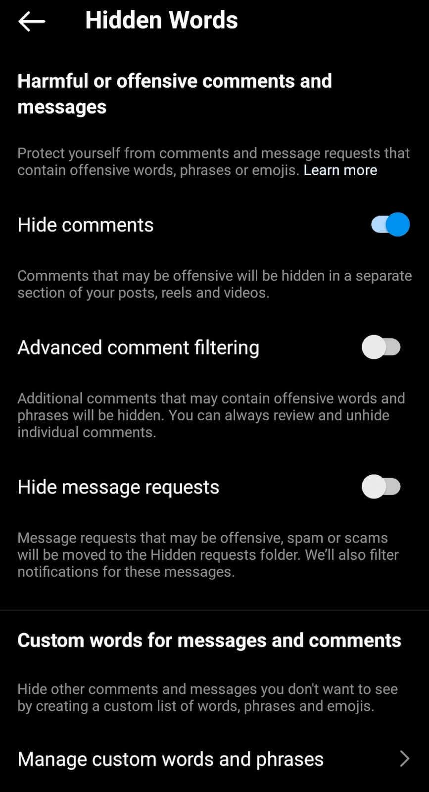 If you want to take it a step further, select Manage custom words and phrases. In this section, you can add specific words, phrases, and even emojis that Instagram’s algorithm will filter out from your comment section.