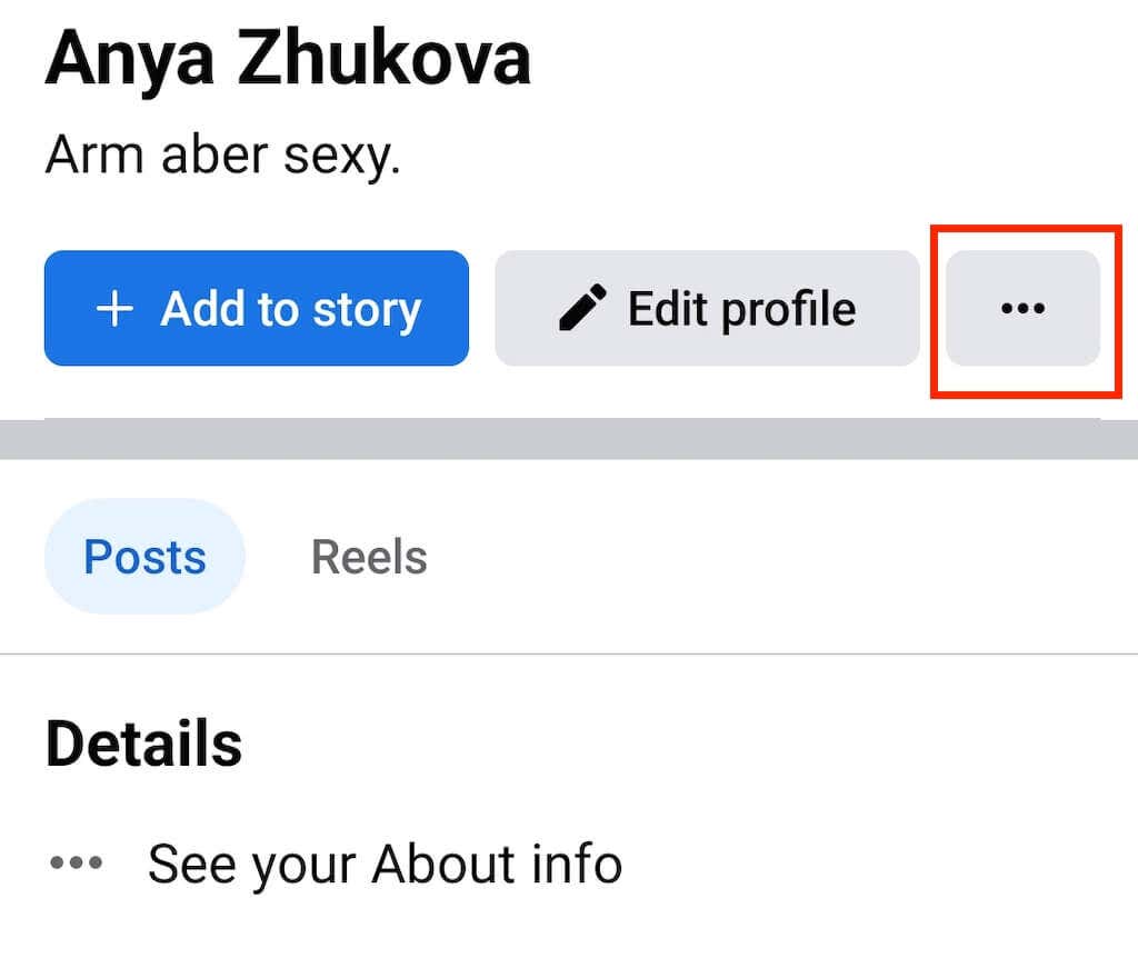 - On your profile page, in the tabs menu beneath your name, select the three dots icon to the right of the Edit profile option to open your profile settings.