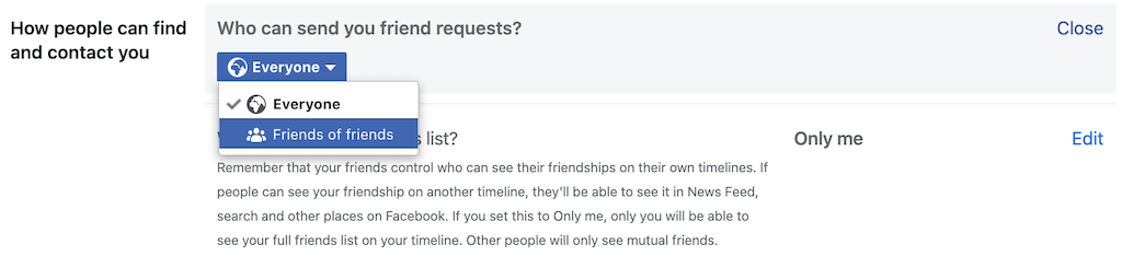 - Change who can add you as a friend. You can control who can send you friend requests and change it to only friends of current friends. To do that, follow the steps below.