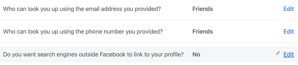 - Prevent people from finding your profile online. When you create a Facebook profile, you make it easier for people to look you up on the internet. They can find your profile by phone number or email address. People can also see your friends list, even if they aren’t friends with you on Facebook. You can change these things by tweaking your privacy settings. To do that, follow the path Settings & Privacy > Settings > Privacy > How people find and contact you. In this section, you can set all options to Friends or Only me. Set the final option to No to prevent people from being able to Google you.