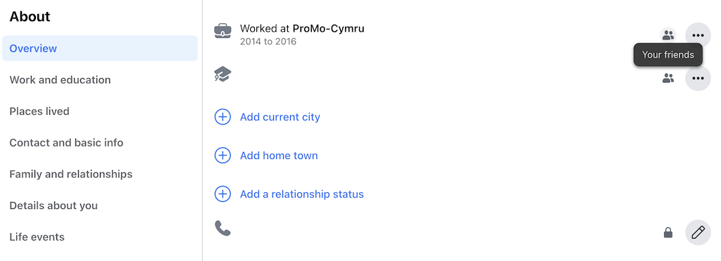 You can make this information private manually without locking your profile. To do that, go to the About section of your Facebook profile. Then select the pencil icon next to each bit of information that you want to hide and set the privacy to either Friends or Only me (to hide it from everyone completely). Select Save when you’re finished to save the changes.