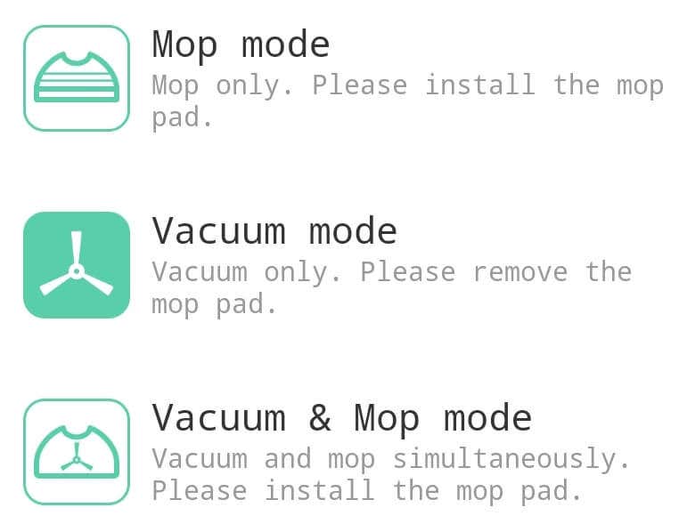 The robovac has three cleaning modes you can switch between: mop mode, which requires the installation of the mop pad, vacuum mode, which can be performed without the mop pad, and vacuum & mop mode, which makes the robovac vacuum and mop simultaneously.