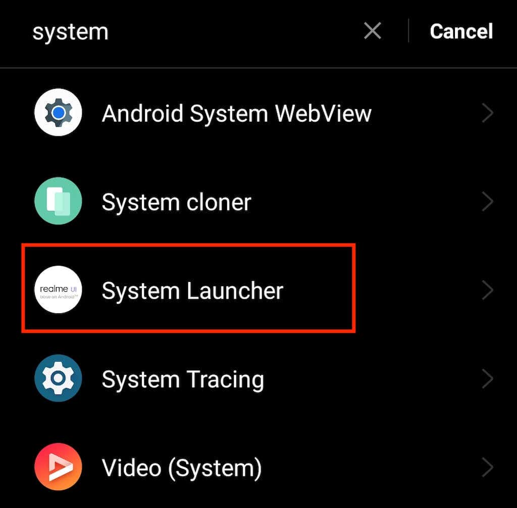 - Search for the default launcher in the list of apps. Then select it.