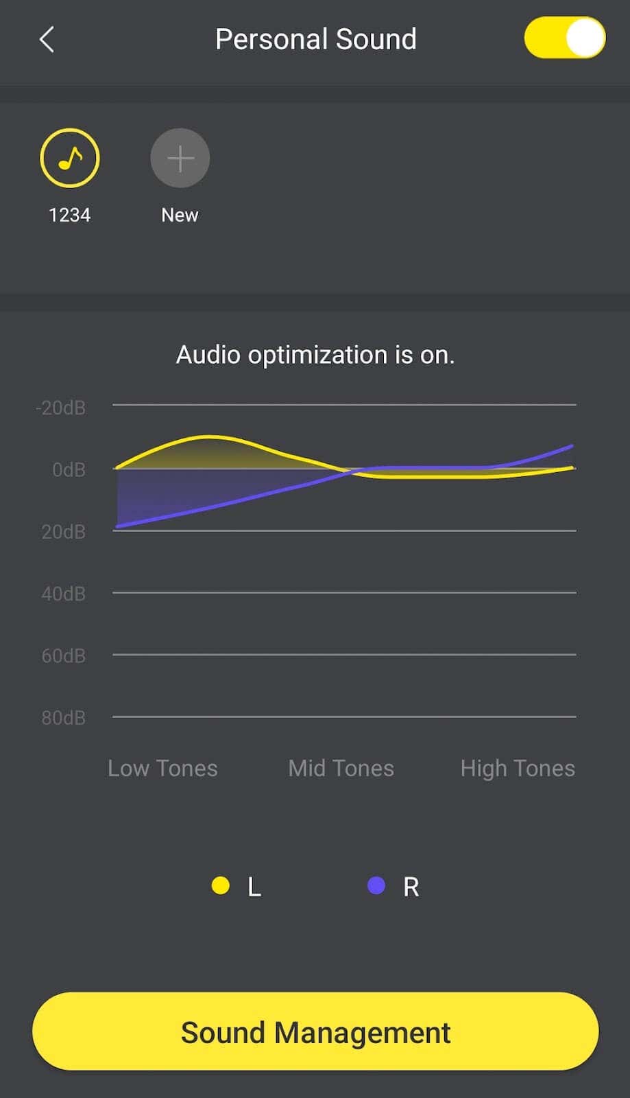 In the Personal Sound tab, you can create an Audiodo Personal Sound profile. You’ll need to go through a quick hearing test to do that. Make sure you’re in a quiet place before you start the test. After saving the results, you can create a new profile for yourself or someone else.