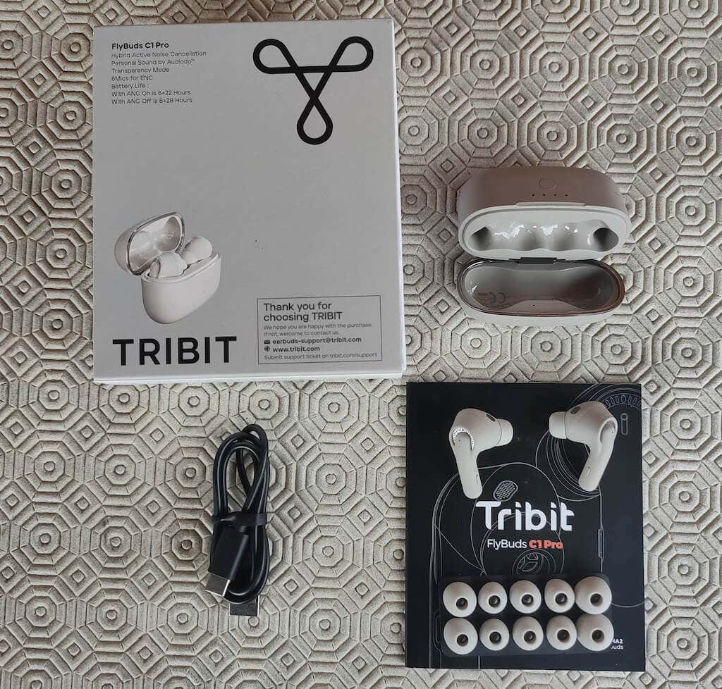 Here’s everything you’ll find in a box when unpacking your Tribit FlyBuds C1 Pro: