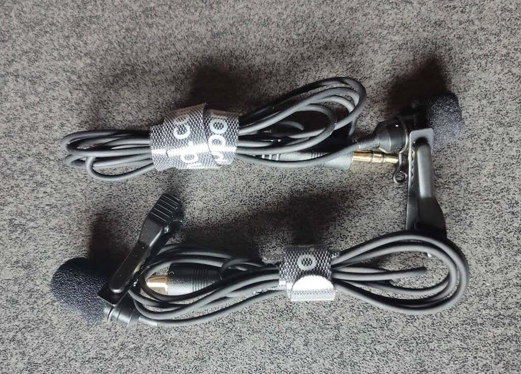 If you don’t like how the transmitter looks on camera (especially with the fluffy protector on), you can use the external lapel mics (or lavalier mics) when recording. The lav mics included in the kit are pretty basic, but they get the job done. They’re on the shorter side, but they should be enough to connect to a transmitter and put it in your pocket.