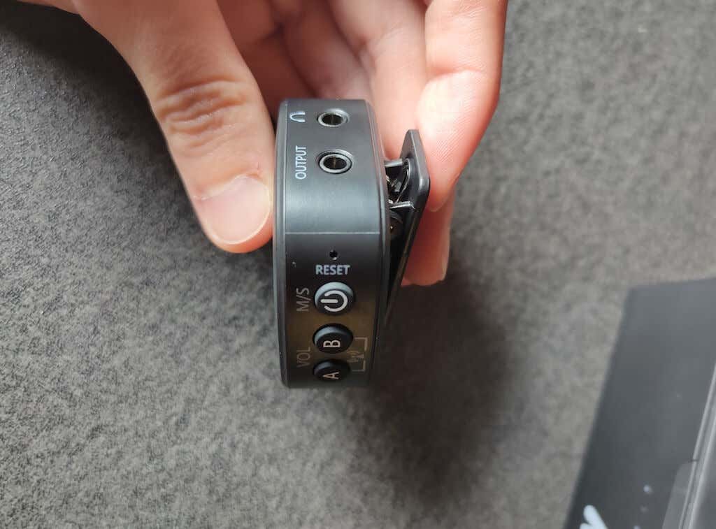 The receiver has a power button that also works as a switch from mono to stereo mode and volume control buttons. On the side of the receiver, you’ll see a headphone jack for plugging in your headset and an output jack.