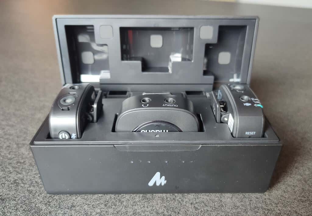 When you first get your hands on the Maono WM821, you’ll notice how stylish all parts (including the charging case) look. Inside the case, you’ll find two transmitters and a receiver. Each of them feels lightweight and has a clamp on the back that you can use to attach to your clothes.