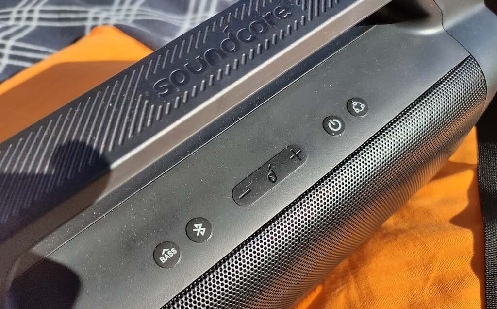 On top of the speaker, you’ll find the control buttons beneath the handle. There’s a button to activate the Soundcore’s BassUp technology, a Bluetooth button, a power switch, and a button for enabling PartyCast. The buttons get illuminated when they’re in use. In the center of the panel, there’s a rubber strip with the volume controls and a play/pause button.