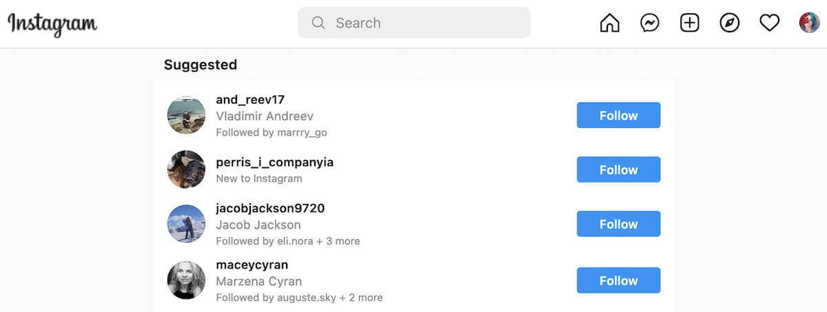 To see the full list of recommended profiles, go to the Instagram website, find Suggestions For You under your profile picture on the homepage, and select See All next to it.