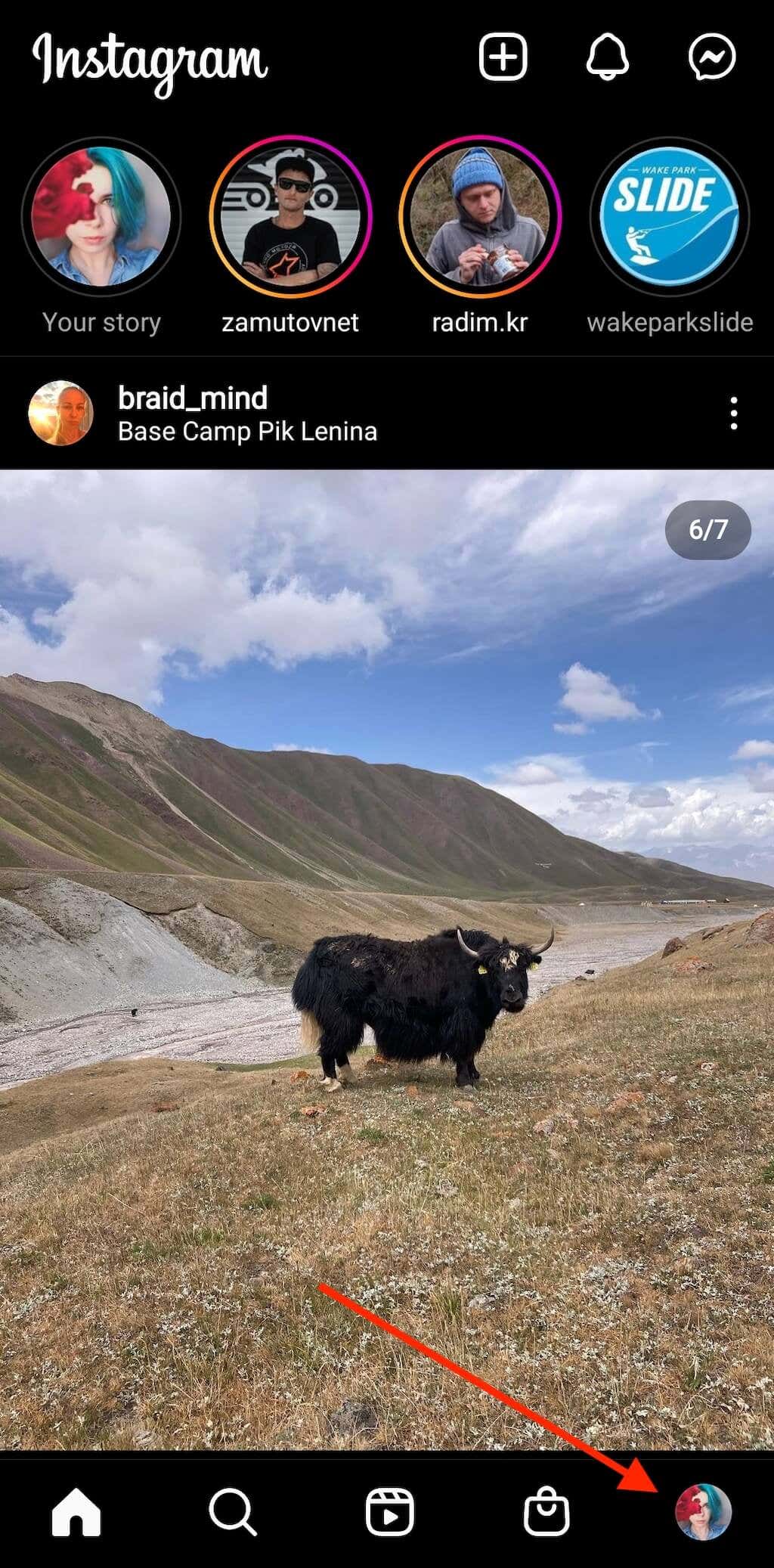 - At the bottom-right corner of the screen, select the profile picture icon to open your Instagram profile page.