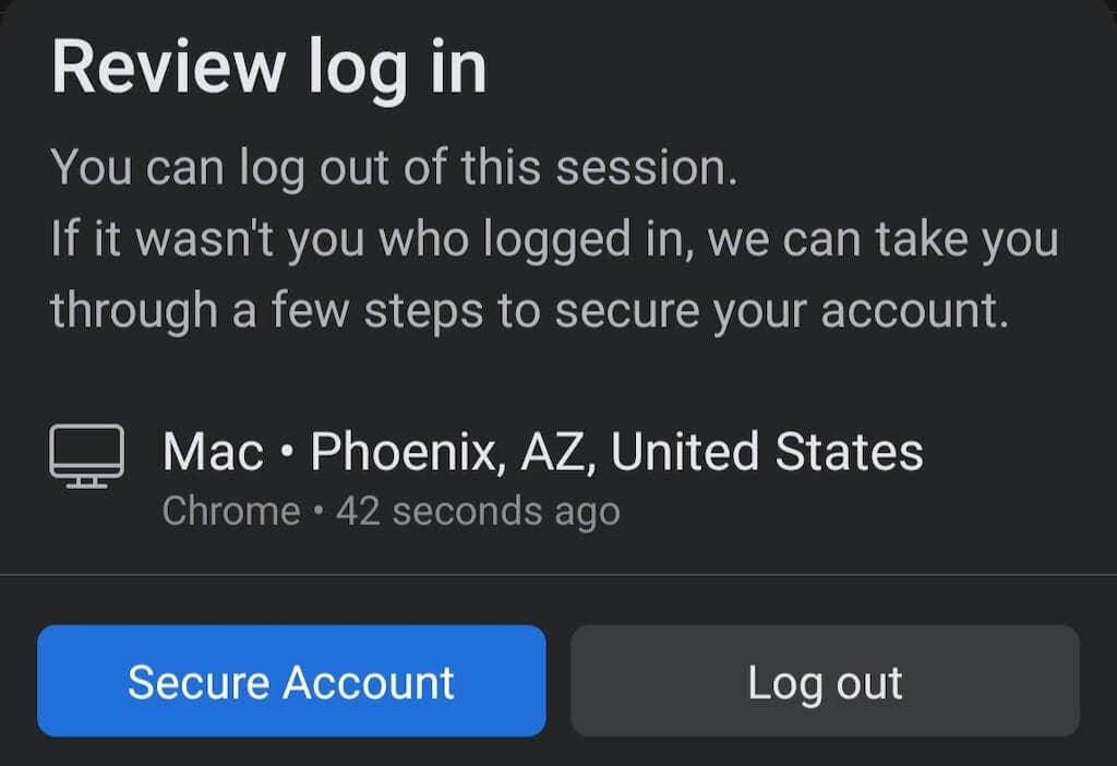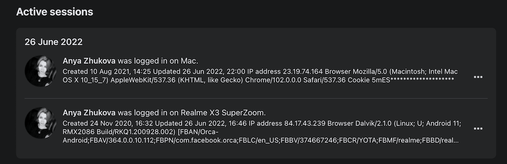 There you’ll see all of your active Facebook sessions, i.e. a list of devices that are logged into your account right now. If you see any unrecognized logins on the list, there’s a chance that you’ve been hacked. To avoid the loss of any sensitive information, next to the active session from the list that you don’t recognize, select Log out. This will end an active session and thus save you from a hacking attempt on that device.