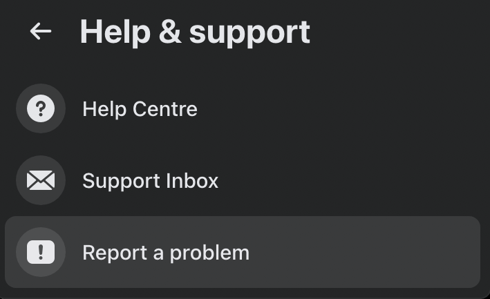 One way to contact Facebook is through Help & support. You can do it both on smartphone and desktop. To submit your report to Facebook, open Menu in the upper-right corner of the screen, and follow the path Help & support > Report a problem.