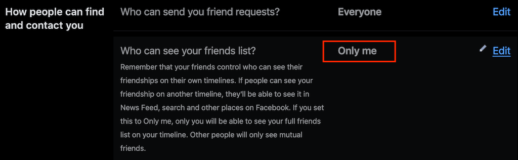 In the mobile app (iOS and Android), the path’s a little different: Settings & privacy > Settings > Audience and visibility > How people find and contact you > Who can see your friends list. For maximum privacy, choose the Only me option, and you’ll be the only person who can see your friends list.