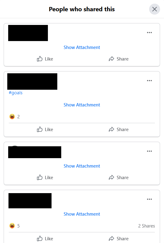 - You can click on the number of people sharing the post to see individual shares from each person, including any comments they may have added as well as people who have reacted to the shared post.