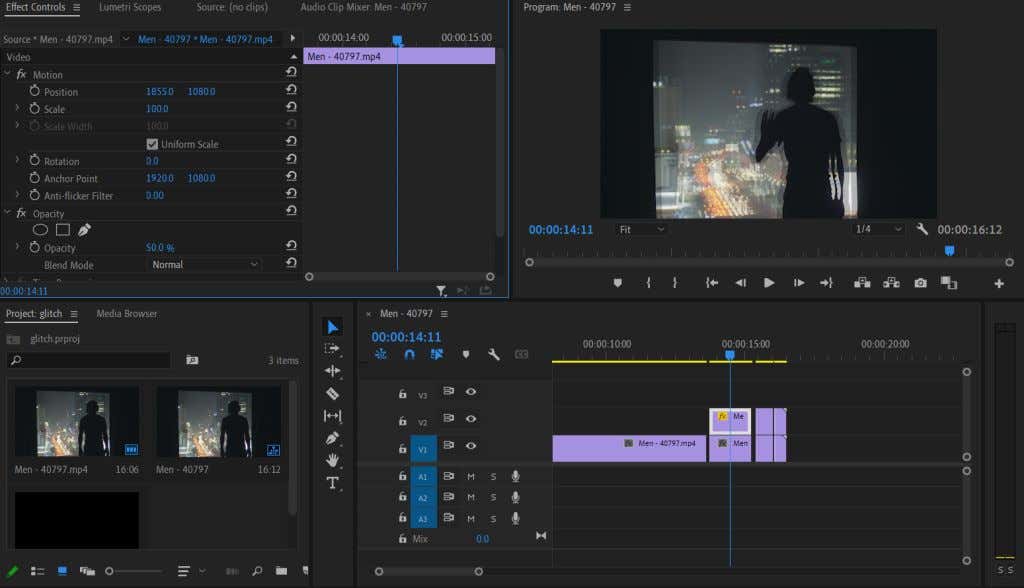 - Select one of the duplicated clips and go to the Effect Controls panel. Go to the Opacity value, and set it to 50%. Then, under the Motion dropdown, change the Position values so that the overlay duplicate clip is slightly off from the original. Do this step with the rest of the duplicates as well. You’ll want to change up the position and possibly the scale values to create some variety in the glitch. You can also play with Blend Mode to get different looks.