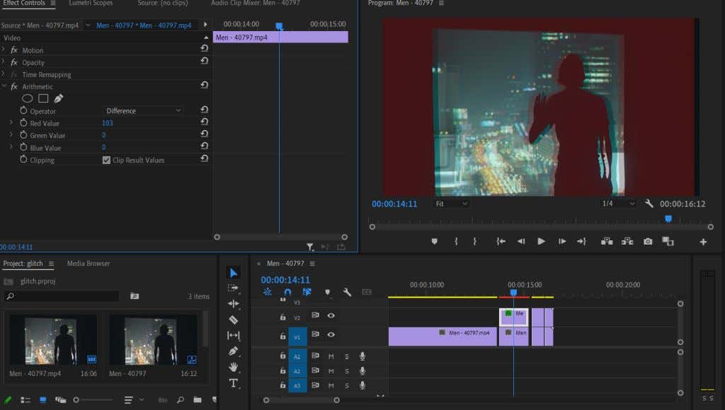 - Go to the Effect Controls panel, and under Arithmetic, change the value of one of the color channels to achieve the RGB glitch effect. Also, change the Operator dropdown to Difference. This changes the blending option to get a cleaner look.