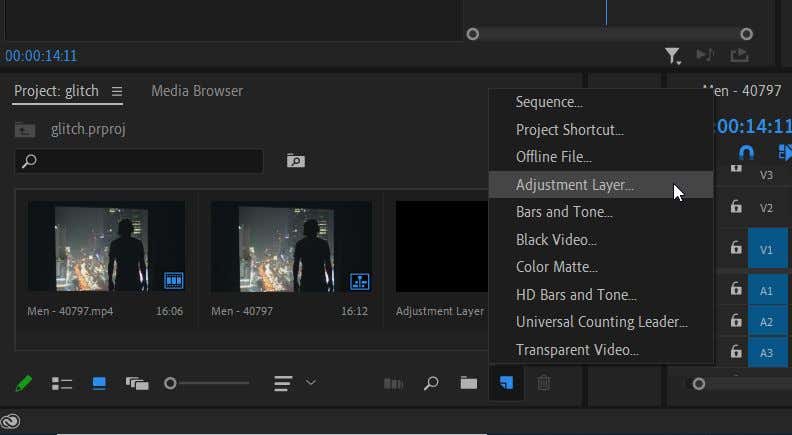 - First, you’ll want to add an adjustment layer to apply the wave effect to both the original and duplicated clips. Go to the bottom-right corner of the Project panel and select New Item > Adjustment Layer. Next, drag the created layer from the Project panel onto the V3 timeline above the cut-up clips.