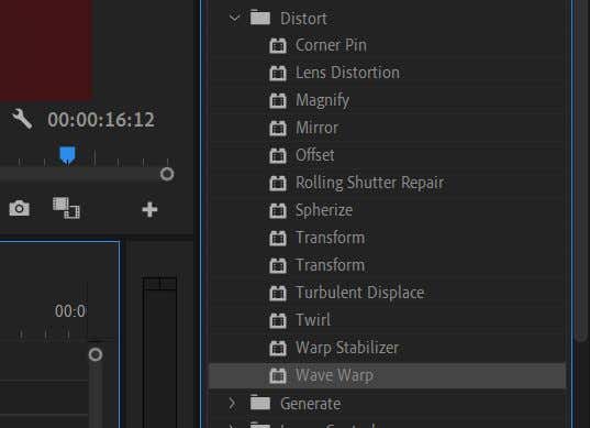 - Go to the Effects panel and go to Video Effects > Distort > Wave Warp. Drag it to your adjustment layer.