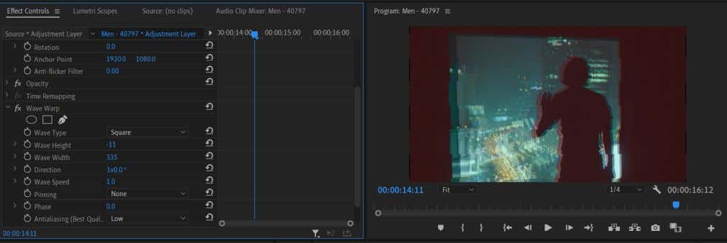 - Now go into the Effect Controls panel and open the Wave Warp dropdown. Here you can play with the effect until it looks the way you like. To achieve a true glitchy effect, try out the Square option in the Wave Type dropdown.