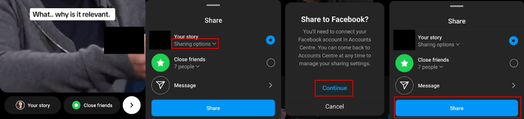 - When the Share to Facebook screen appears, tap Continue. If your Facebook and Instagram accounts aren’t already connected, follow the on-screen prompts to link your accounts.