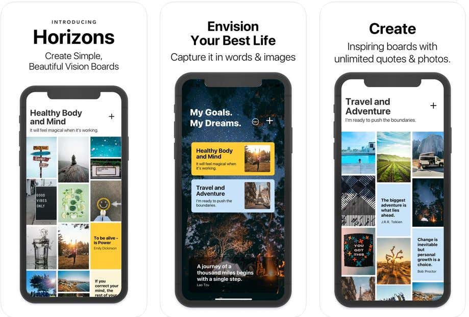 This app is packed full of features for you to create multiple vision boards for different areas of your dream life. The app will show you how to create your first board, and from there you can add more pictures or text as you wish. You’ll also see some inspiring quotes added in by the app.