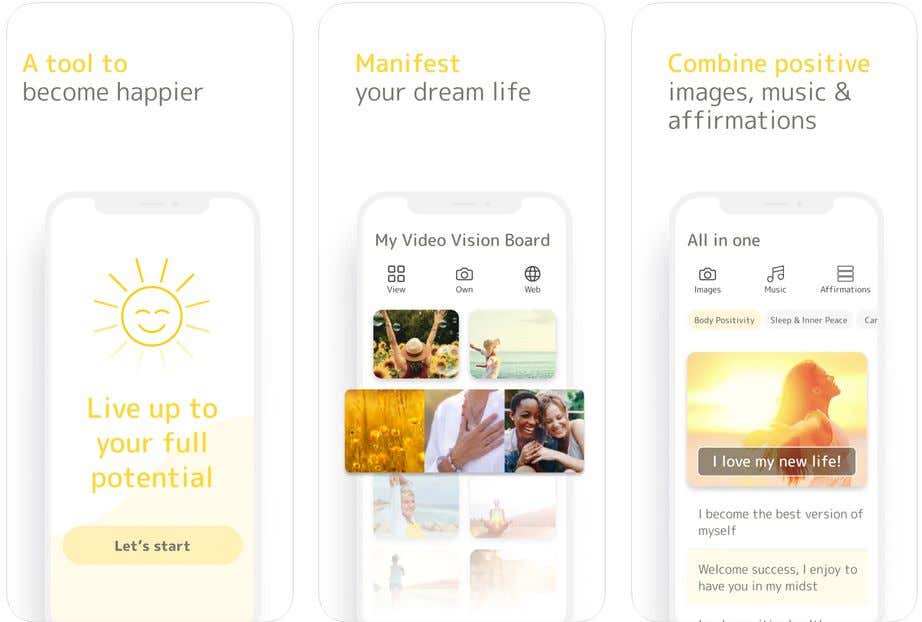 This app is a great way to create a vision board and goal-setting system that you can refer to often. You can add any pictures you want, add a filter if you wish, and write your affirmation as a caption on the photo. You can tap on the eye icon to have a slideshow play of your vision board. You can also go into the settings to change the music being played, including music off your phone.