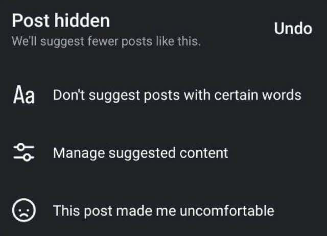 Instagram will immediately hide this particular post and try not to show you similar posts in the future. You’ll also see a box with suggestions, from which you can choose: Don’t suggest posts with certain words, Manage suggested content (more about this option in a bit), and This post made me uncomfortable. Feel free to choose any of these options to tailor your Explore page content even further.