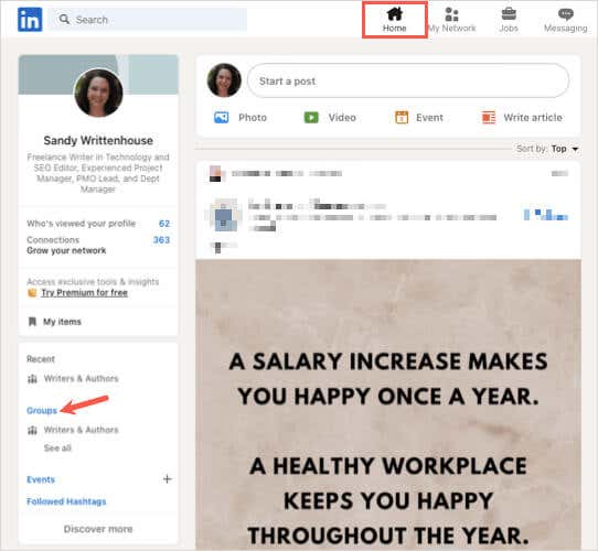 - Go to the Home tab on the LinkedIn homepage and select Groups on the bottom left side.