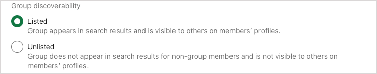 Group discoverability (required): You can choose Listed or Unlisted for this option. Listed means that the group appears in search results and on the profiles of its members. Unlisted is the opposite, the group won’t appear in searches and is not visible on member profiles.