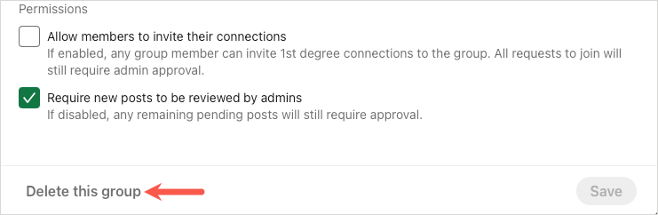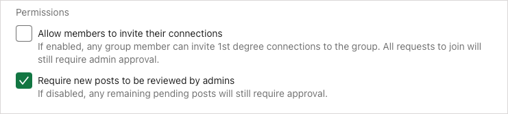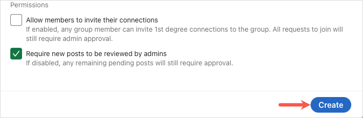 Permissions (optional): Check the first box if you want to let your members invite their connections and the second box if you want to review posts before they’re published. If you do check the box to review posts, you have 14 days to do so before the post is visible to the group.
