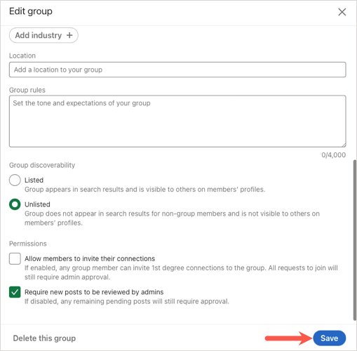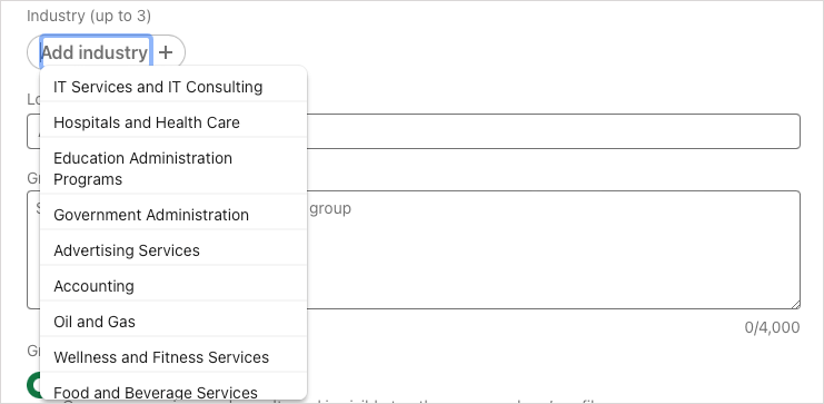 Industry (optional): If you’d like to include a related industry for the group, you can add up to three. This is helpful for specific industries and relevant careers.
