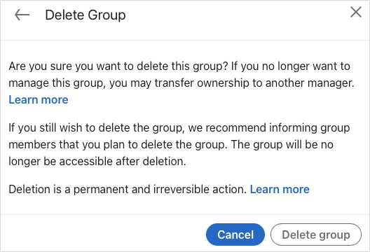 Tip: You can transfer ownership of the group to one of the group’s owners rather than delete it if you prefer.