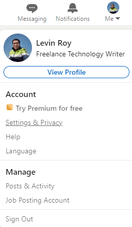 - First, open LinkedIn on your web browser and click on the small profile picture visible at the top right. Select Settings & Privacy from the drop-down menu.