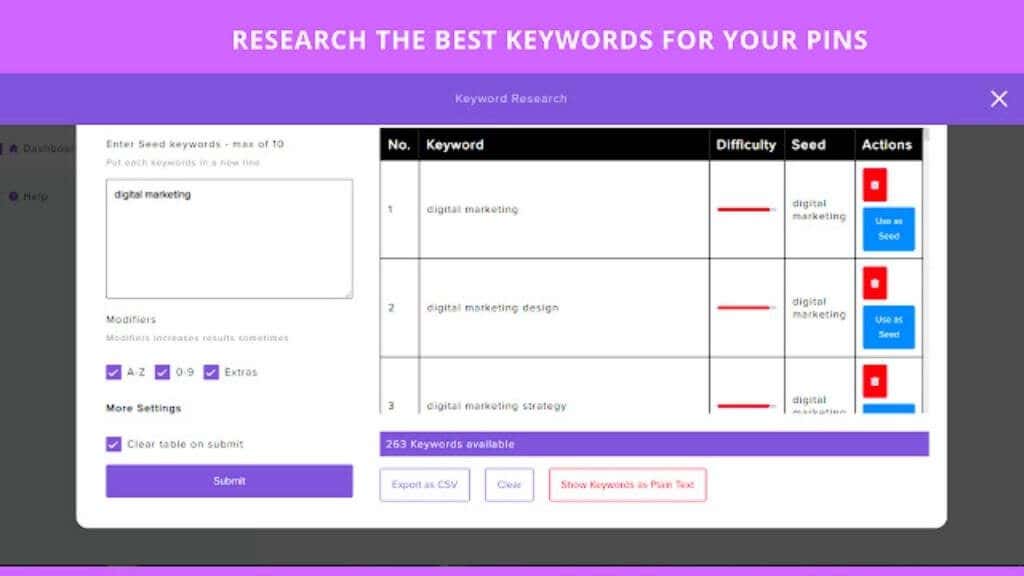 This extension from Pindodo makes it easy to access their Pinterest ranking data and tools to make sure you pick keywords that will put your Pins on the first results page on Pinterest.